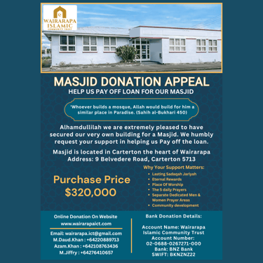 Wairarapa Islamic Community Trust is fundraising for a Masjid in Carterton, Wairarapa, New Zealand. The Wairarapa Islamic Community Trust, based in the Wairarapa, the Wellington Region, has signed a sale and purchase agreement to purchase a property at 9 Belvedere Road, Carterton, located in the heart of the Wairarapa. The property is intended to serve as a permanent place of worship and a community gathering space.