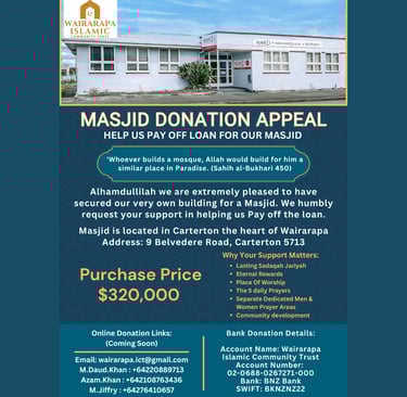Wairarapa Islamic Community Trust fundraising for Mosque a in Carterton, Wairarapa, New Zealand. The Wairarapa Islamic Community Trust, based in the Wairarapa, the Wellington Region, has signed a sale and purchase agreement to buy a property at 9 Belvedere Road, Carterton, located in the heart of the Wairarapa. The property is intended to serve as a permanent place of worship and a community gathering space.